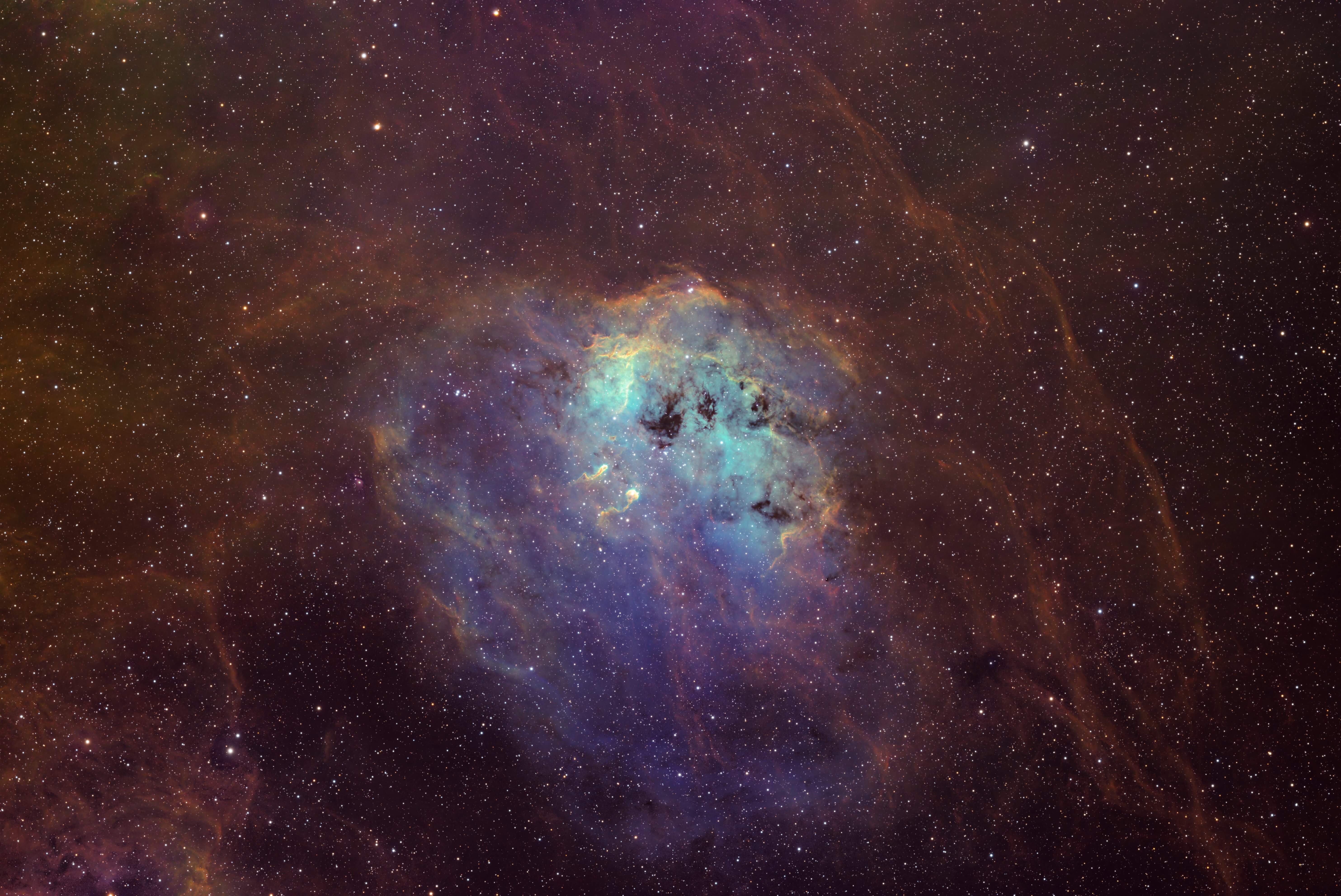 Bonjour à tous en ce dernier jour de 2025 ! Je vous propose la version SHO de la nébuleuse de la Méduse. Aux précédentes poses faites (170 x 120s Ha+OIII) j'ai ajouté 200 x 120s pour le SII Astrobin Bon réveillon.