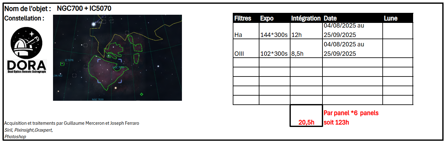La Team Dora vous présente une mosaïque de 6 panels faite cette été depuis le site d'hébergement de Trevinca. 🌌 NGC 7000 et IC 5070 – c’est quoi ?Dans le ciel, dans la constellation du Cygne, il existe deux grands nuages de gaz et de poussière que les astronomes adorent photographier : NGC 7000, appelée nébuleuse de l’Amérique du Nord IC 5070, appelée nébuleuse du Pélican On leur a donné ces noms parce que leurs formes rappellent le continent américain et un pélican quand on les regarde en photo. ⭐ D’où viennent ces nébuleuses ?Ces nuages brillent parce qu’ils sont éclairés par des étoiles très chaudes, proches d’eux. La lumière de ces étoiles fait « rougir » le gaz, un peu comme une lampe qui éclaire une fumée. 🚼 Des zones où naissent des étoilesCe sont des endroits où de nouvelles étoiles sont en train de se former. À l’intérieur : le gaz se rassemble, des noyaux s’effondrent sous leur propre poids, et cela donne naissance à de nouvelles étoiles. Autrement dit, ce sont des maternités stellaires ! 🌍 Où sont-elles ?Elles sont situées dans : la constellation du Cygne (facile à voir en été dans l’hémisphère nord), à environ 2 500 années-lumière de la Terre, et elles font partie du même grand nuage dans notre galaxie. Sur les photos : NGC 7000 est à gauche, IC 5070 à droite, séparées par une bande sombre de poussière. 🔭 Pourquoi sont-elles célèbres ?Elles sont super photogéniques pour les astrophotographes, même amateurs. Elles sont immenses et bien visibles en pose longue. Elles montrent très bien comment se forment les étoiles. -------------------------------------- Copyright: ChatGPT Prompts: 1- donne moi du contexte simplifié sur la nébuleuse NGC7000 et IC5070 -------------------------------------- A ce stade, cela reste une des images qui a été la plus difficile à capturer car elle a nécessité 6 panels en HA/OIII qui ont été capturés sur 2 mois d'été avec des conditions différentes entre le début et la fin de la capture et les feux de forêt qui sont venus perturber tout ça... La palette choisie pour cette image est la palette FORAXX que certains d'entre-vous pratiquent peut-être et qui donne cette coloration ocre caractéristique. Maintenant c'est à vous de nous dire ce que vous en pensez... Team Dora