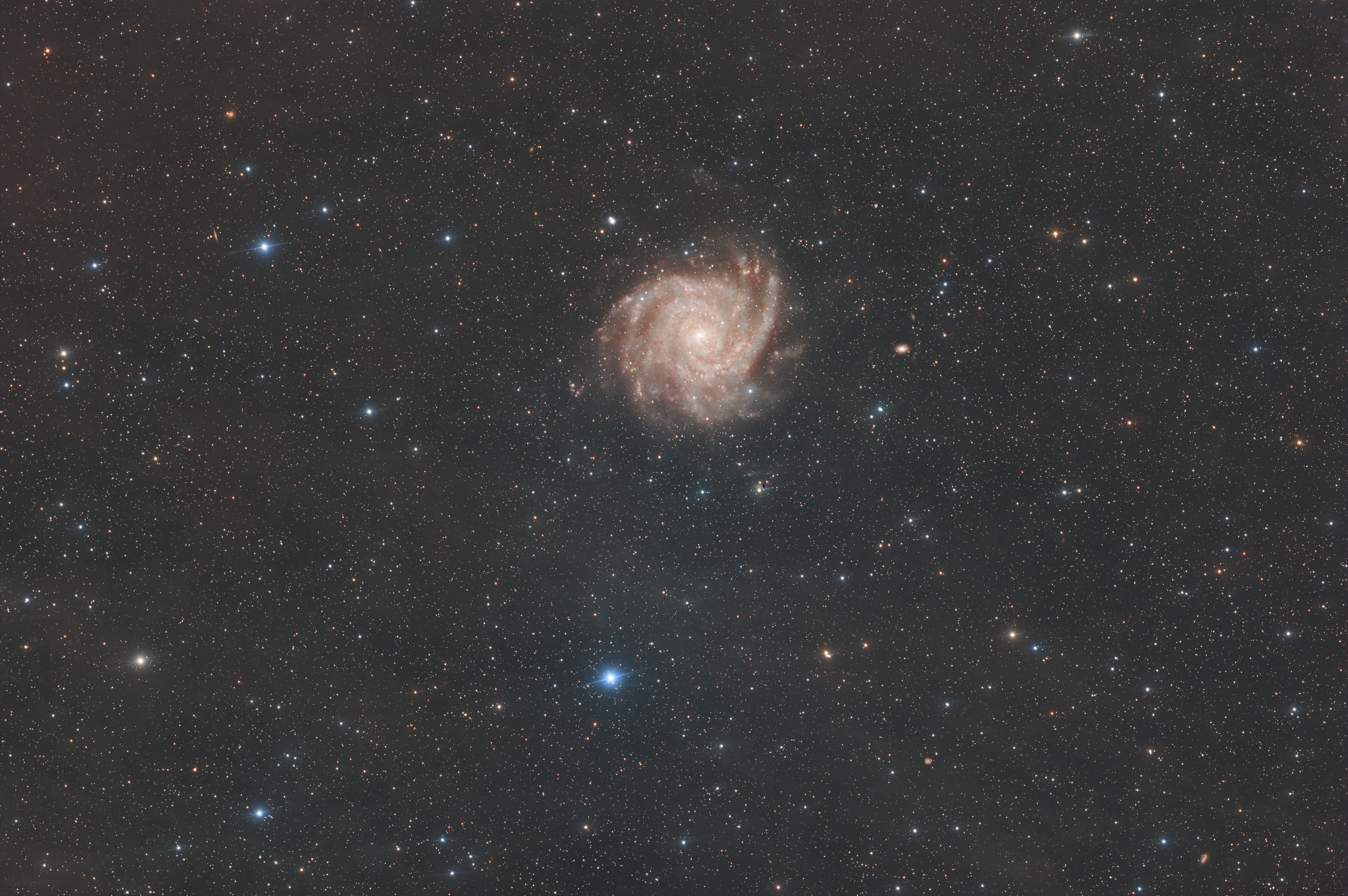 🌌 Présentation générale IC 342 est une galaxie spirale située dans la constellation de la Girafe (Camelopardalis), à une distance estimée entre 10 et 11 millions d’années-lumière. Elle fait partie du groupe de galaxies de Maffei et constitue une voisine relativement proche de la Voie lactée. 🌫️ Une galaxie difficile à observer IC 342 est souvent surnommée la galaxie cachée en raison de sa position proche du plan galactique. L’absorption due aux poussières et au gaz de la Voie lactée réduit fortement sa luminosité apparente et son contraste, ce qui complique son observation visuelle comme photographique. 🌀 Structure morphologique L’image révèle une structure spirale tardive aux bras très ouverts, richement structurés. On distingue clairement le bulbe central, entouré de bras spiraux ponctués de régions HII et traversés par de nombreuses bandes de poussières qui découpent finement le disque. ✨ Activité et formation stellaire IC 342 est une galaxie riche en gaz, avec une activité soutenue de formation d’étoiles, particulièrement marquée dans ses bras spiraux. Le noyau montre également une dynamique interne complexe, suggérant une interaction active entre le gaz et le potentiel gravitationnel central. 📸 Intérêt en astrophotographie Malgré sa grande taille apparente, IC 342 présente une faible luminosité de surface, ce qui en fait une cible exigeante. Elle nécessite des temps de pose importants et un traitement soigné pour faire ressortir les structures fines sans être dominées par le champ stellaire dense de la Voie lactée. 🔭 Conclusion IC 342 illustre parfaitement le paradoxe de certaines galaxies proches : vastes, riches et dynamiques, mais longtemps restées discrètes en raison de notre propre environnement galactique. Une cible fascinante qui gagne à être revisitée avec des moyens modernes d’observation et de traitement. Copyright: ChatGPT Prompts: pourrais-tu me donner du contexte pour commenter une image de la galaxie IC342 pour un forum d'astronomie. Image plus difficile qu'il n'y parait. C'est fait avec des bouts de fin de nuit pour attendre le lever du soleil après d'autres objets. Donc conditions pas simples avec un ciel pas totalement dégagé et ayant tendance à s'éclaircir. Bravo à Guillaume pour son traitement qui montre de jolies couleurs mais aussi le début des IFN que j'apercevais à peine sur mon premier traitement à l'arrache. Finalement elle n'est pas si cachée que ça cette galaxie. Team DORA