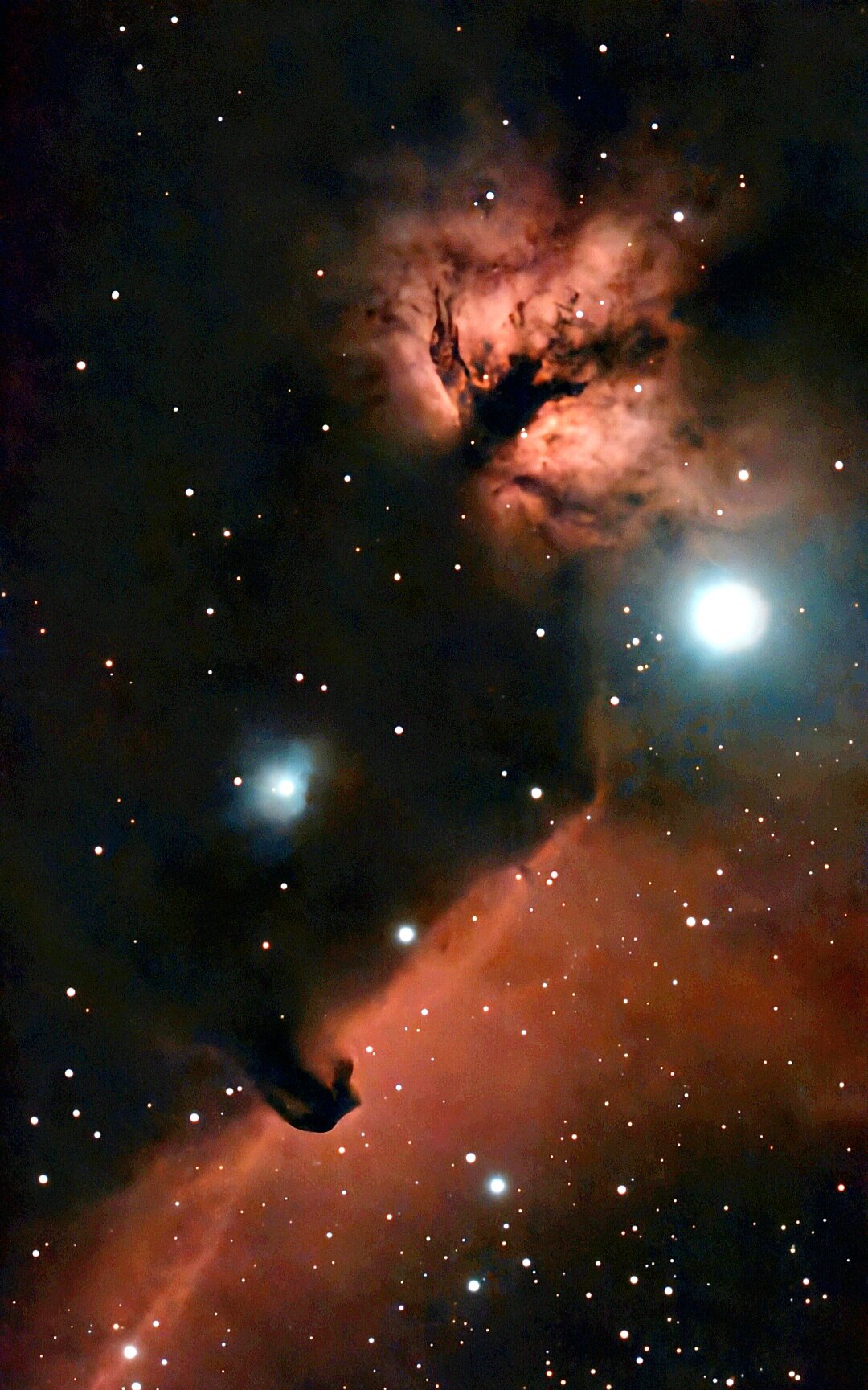 Dans mes souvenirs, le premier livre de ma bibliothèque s'intitulait "Les planètes". Ma maman me l'avait acheté en 1962. Les photos me fascinaient, bien qu'elles fussent plutôt floues et peu précises. Plus d'un demi-siècle à passé avant que j'aie l'occasion de mettre mon œil derrière l'oculaire d'un télescope. Ce fut le point de départ de mon intérêt pour l'astrophotographie. Au rout début, je prenais des photos avec un boîtier Canon 450D prêté par un copain avec un 50mm. J'étais excité comme une puce lorsque je parvins, en zoomant comme un fou, à apercevoir quelque chose d'autre que des étoiles sur une photo : une galaxie. J'étais ferré, bien décidé à poursuivre pour voir plus et mieux ce qui habite le ciel que je ne qualifiais pas encore de profond. La quête ultime serait pour moi de parvenir à voir la "Tête de 🐴 " sur une de mes photos. Un jour, je suis arrivé à la pointer et à obtenir la forme caractéristique d’IC434 sur un cliché noir et blanc et à la définition approximative. Je me souviens avoir ressenti un profond soulagement. Ma quête aboutissait après plusieurs années d'approches, d'errance et d'apprentissage. Aussi c'est toujours avec une pointe d'émotion que je shoote, chaque hiver, IC434, admirant les voleurs rendues par les outils et traitements que j'utilise désormais. Nuit du 23 janvier 2026, Seestar S50, 106 x 20s. Empilement via l'outil du Seestar et traitement photo via smartphone.