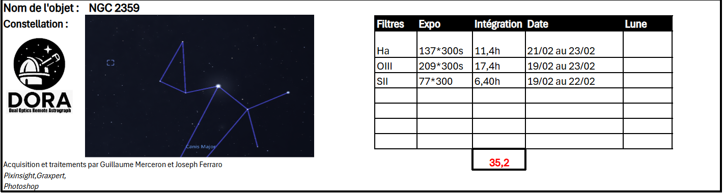 🌌 NGC 2359 – Le Casque de Thor (palette SHO) Située à environ 15 000 années-lumière de la Terre, NGC 2359 est une nébuleuse en émission spectaculaire façonnée par une étoile massive en fin de vie. Surnommée le Casque de Thor en raison de sa forme évocatrice, elle se trouve dans la constellation du Grand Chien. Cet objet illustre parfaitement les interactions violentes entre les étoiles évoluées et leur environnement, donnant naissance à des structures complexes et dynamiques. ✨ Au cœur de la nébuleuse se trouve l’étoile Wolf-Rayet WR 7, une étoile extrêmement chaude et instable qui éjecte de puissants vents stellaires. Ces vents entrent en collision avec le gaz environnant, comprimant et sculptant la matière pour former les bulles, filaments et arcs de choc caractéristiques observés ici. 🎨 Cette image a été réalisée en palette SHO (SII, Hα, OIII), une technique de traitement en bandes étroites qui permet de cartographier les différentes émissions : Le soufre (SII) met en évidence les régions denses et souvent plus froides. L’hydrogène alpha (Hα) constitue la trame principale de la nébuleuse. L’oxygène ionisé (OIII) révèle les zones les plus énergétiques et les extensions diffuses. 🔍 Le traitement vise à maximiser la lisibilité des structures fines tout en conservant un équilibre chromatique propre à la palette SHO. Les contrastes ont été travaillés pour faire ressortir les filaments turbulents et les fronts de choc, témoins de l’activité intense de cette région. 🚀 On distingue particulièrement les extensions latérales évoquant des "ailes", ainsi que les zones externes soufflées par les vents stellaires, donnant à l’ensemble cet aspect dynamique et presque tridimensionnel. Copyright: ChatGPT Prompts: pourrais-tu me donner du contexte pour commenter une image de NGC2359 en filtre SHO pour un forum d'astronomie. Cette image du casque de Thor résume bien l'état d'esprit de la Team DORA, avant tout on veut se faire plaisir ! Si on y réfléchit bien le casque de Thor n'est pas vraiment au centre des cibles pour notre setup... pas vraiment la focale et pas vraiment la bonne latitude, si on y ajoute que la météo hivernale à Valdin a été execrable c'est une image qui a été fortement voulue. Comme à chaque image en filtre étroit, se pose l'impitoyable question des couleurs ! Comme il se doit cette version met à l'honneur le bleu du OIII tout en exploitant les 11h de Ha qui entourent l'objet principal. On espère que ce choix vous plaira. A vos commentaires ! Team Dora